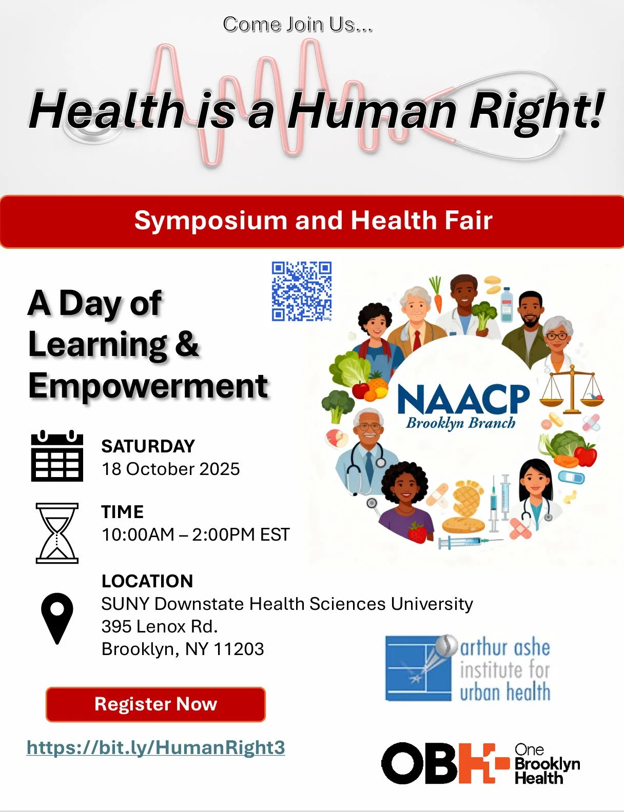 You are invited to join the NAACP Brooklyn Branch and our partners for Health Is a Human Right, Part 3: Health Symposium and Health Fair on Saturday, October 18th, from 10 AM to 2 PM at SUNY Downstate Health Sciences University, 395 Lenox Road, Brooklyn, NY 11203.